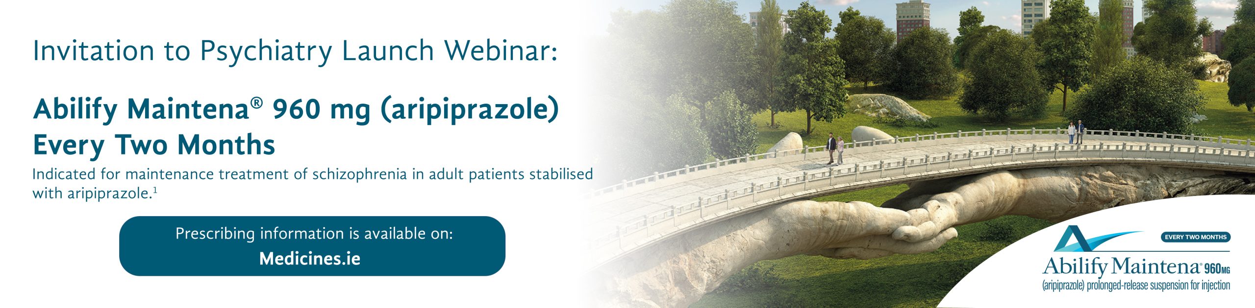 Lundbeck Ireland Ltd are pleased to announce that Abilify Maintena® 960 mg every two months,  prolonged-release suspension for injection in pre-filled syringe will be available from the 10th June . Please join us for the Abilify Maintena® 960 mg Ireland Launch webinar with Dr Leslie Citrome.